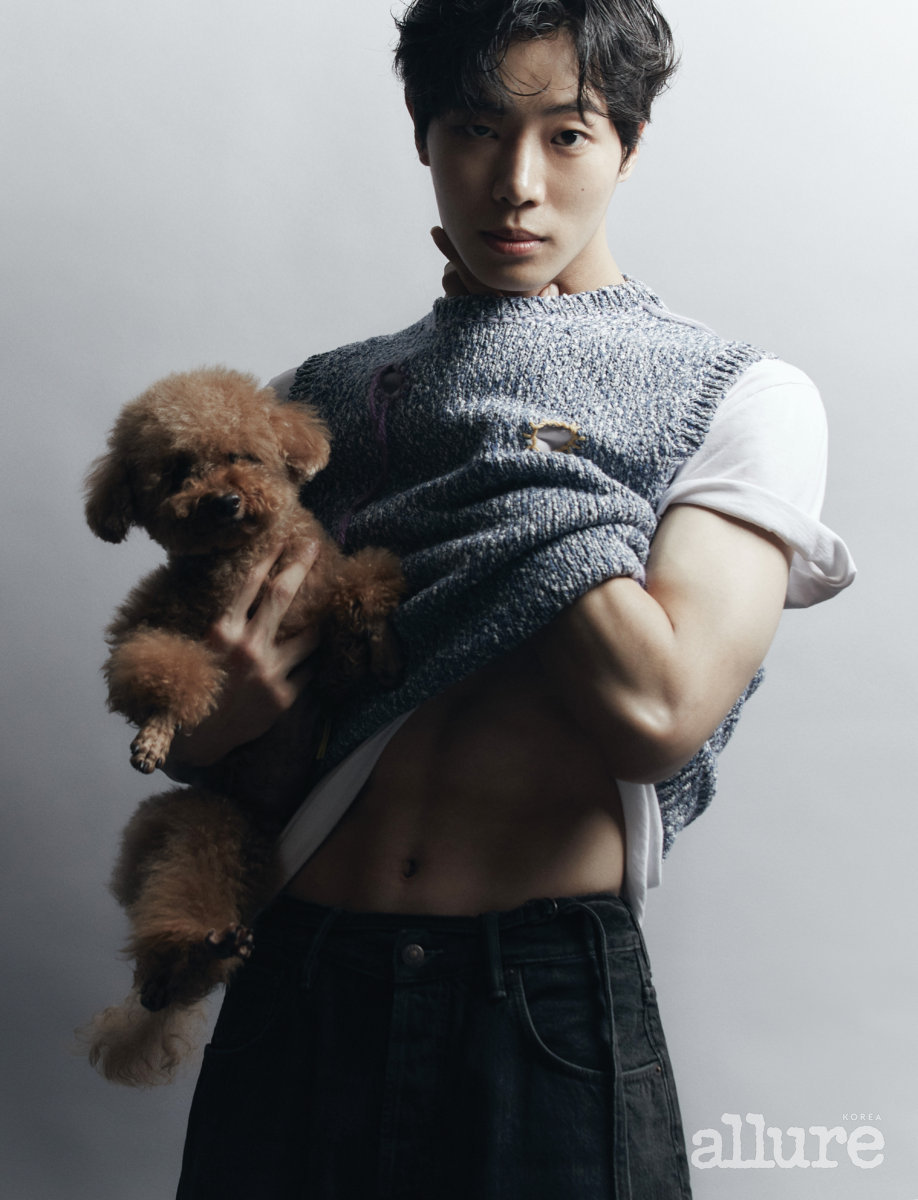 배우 추영우와 두 마리의 갈색 푸들이 처음으로 사진 촬영에 도전했다. 추영우는 그의 부모님에게서 반려동물에 대한 사랑을 배웠다. 티셔츠는 골든 구스(Golden Goose). 니트 베스트, 빈티지 블랙
